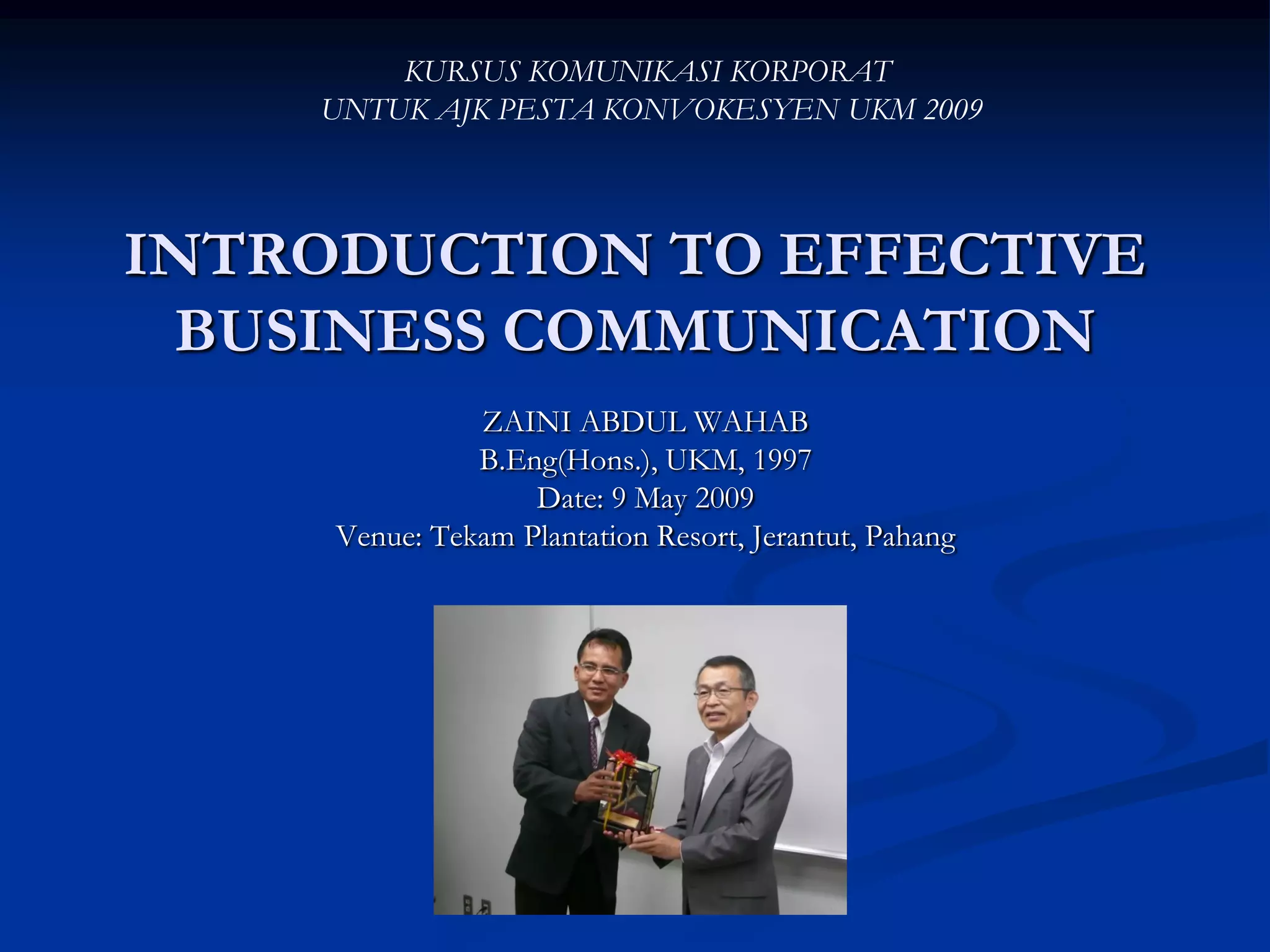 The document is a presentation on effective business communication tailored for the 2009 convocation committee at UKM. It emphasizes the importance of understanding communication as an exchange of meaning rather than just information transfer, highlights the role of non-verbal cues in communication, and outlines guidelines for professional appearance and attire in business settings. Additionally, it covers presentation planning and delivery strategies, decision-making processes, and types of decision-makers, aiming to enhance overall communication effectiveness in professional environments.