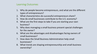 1. The document discusses entrepreneurship and small business management. It covers why people become entrepreneurs, the types of entrepreneurs, characteristics of successful entrepreneurs, and the contribution of small businesses to the US economy.