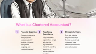 Chartered accountancy is a prestigious profession involving financial management, auditing, and taxation, crucial for business success. Chartered accountants provide financial expertise, ensure regulatory compliance, and offer strategic advice to organizations, while facing challenges such as complex regulations and workload pressures. The future of this field will be shaped by technological advancements, global expansion, and increased roles in strategic leadership.