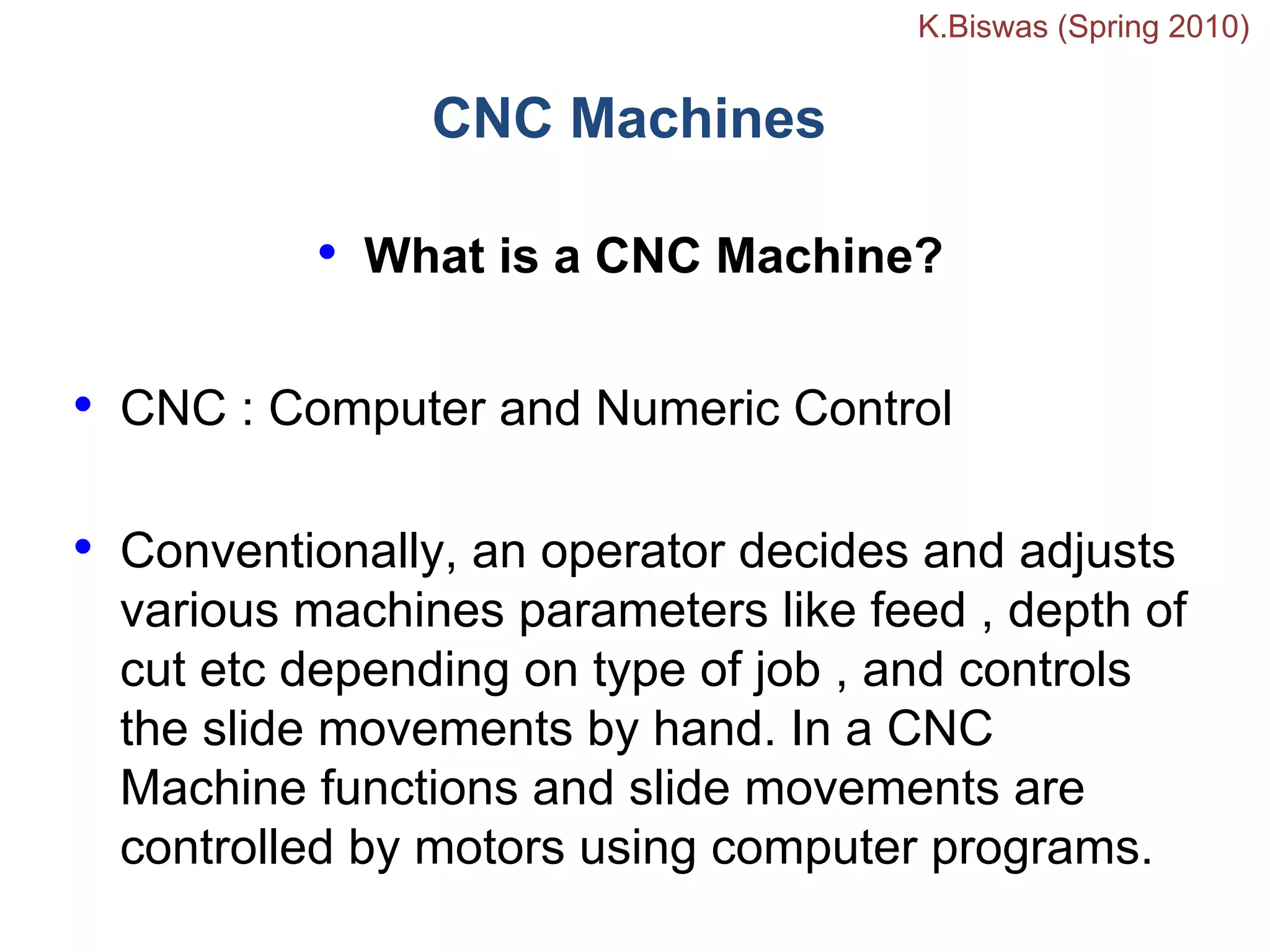 This document provides an introduction and overview of CNC (computer numeric control) machining. It discusses what CNC machines are, how they work by controlling slide movements with computer programs, and the basic components and principles of CNC like axes, coordinate systems, and motion control. It also covers CNC programming basics including G and M codes, tool paths, advantages and disadvantages of CNC, common machine types, and how CAD/CAM systems impact CNC technology.