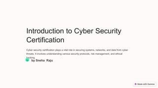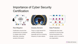 The document discusses the importance and benefits of cyber security certification in protecting systems and data from cyber threats. It outlines different types of certifications available, their advantages for career advancement, and details about the certification process. Additionally, it provides tips for exam preparation and highlights notable certification providers.