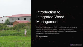 This document discusses integrated weed management (IWM) for sunflower production. IWM uses a combination of cultural, biological, and chemical control methods to manage weeds holistically. Weeds compete with sunflowers for nutrients and light, reducing yields and profits for farmers. Traditional weed control has limitations like herbicide resistance and environmental impacts. IWM follows principles like diversity and prevention to integrate multiple approaches for better weed control. This enhances sunflower health, lowers costs, and protects the environment compared to relying on single control methods.