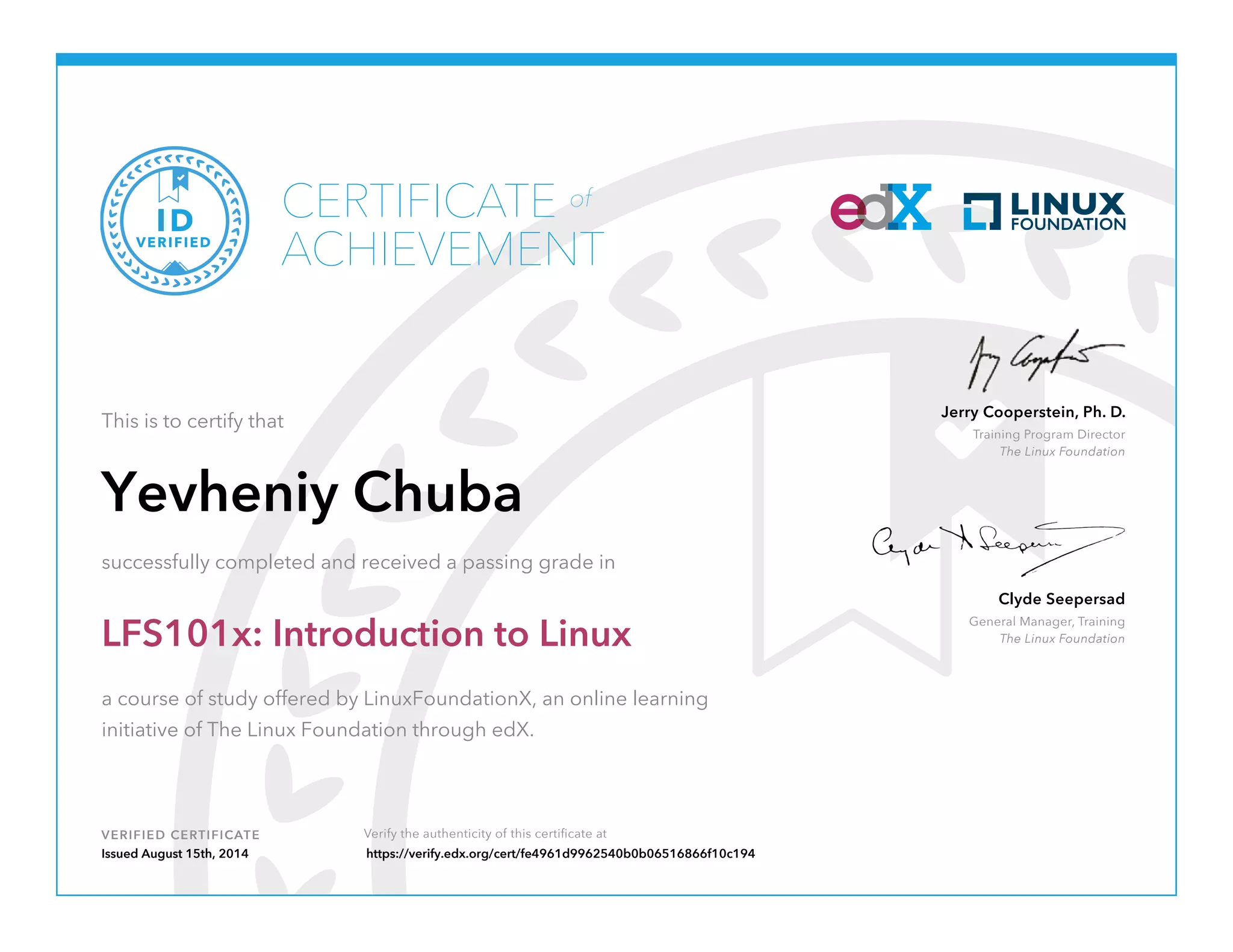 This certificate verifies that Yevheniy Chuba successfully completed and passed the LFS101x: Introduction to Linux course offered by LinuxFoundationX, an online learning initiative of The Linux Foundation through edX. The certificate is signed by Jerry Cooperstein, Ph.D., Training Program Director of The Linux Foundation, and Clyde Seepersad, General Manager of Training for The Linux Foundation.