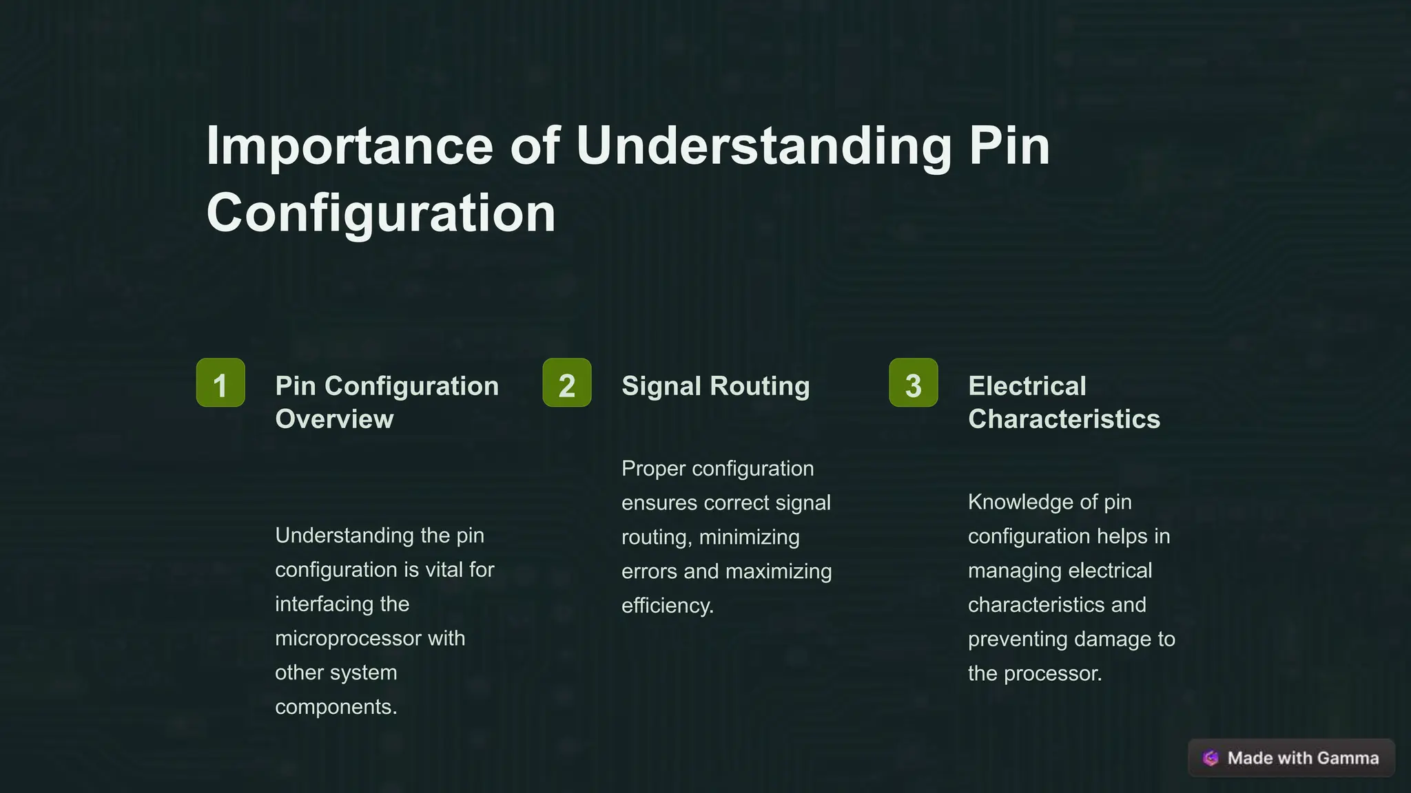 The document discusses the importance of understanding the pin configuration of the microprocessor 8085. It explains that the pin configuration is vital for interfacing the microprocessor with other system components and ensuring correct signal routing. It also describes the different types of pins on the 8085 microprocessor, including address bus pins, data bus pins, and control and status pins. A key takeaway is that comprehensive understanding of the pin configuration is important for efficient integration of the microprocessor within electronic systems and enhanced troubleshooting.