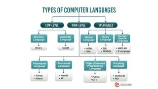 This document provides an introduction to programming concepts such as algorithms, pseudocode, and flowcharts. It defines computer programming as the process of writing code to instruct a computer, and explains that programming languages allow users to communicate instructions to computers. The document outlines different types of computer languages including low-level languages like machine language and assembly language, and high-level languages like procedural, functional, and object-oriented languages. It also discusses specialized languages, translator programs, and program logic design tools for solving problems algorithmically through pseudocode and flowcharts.