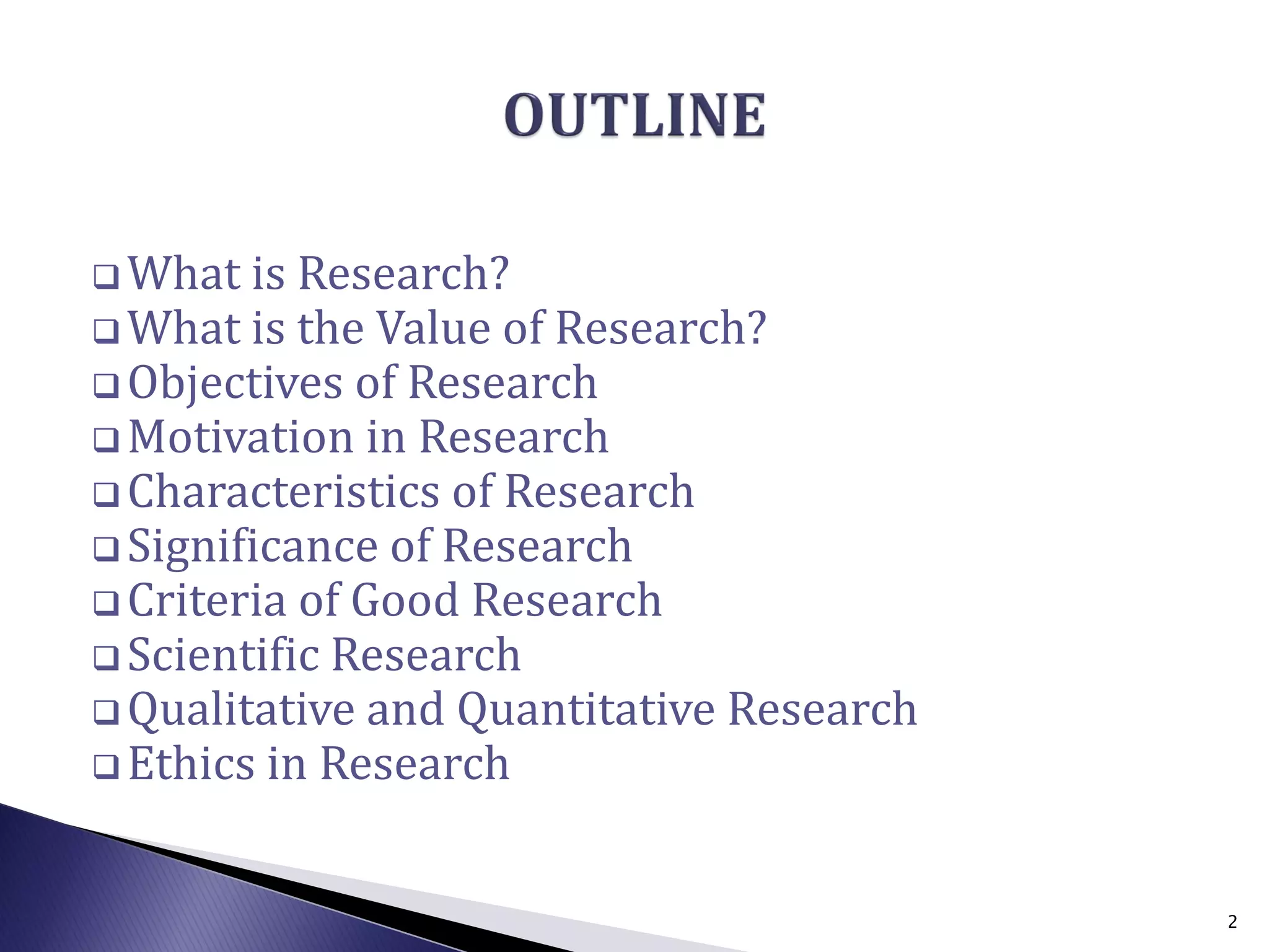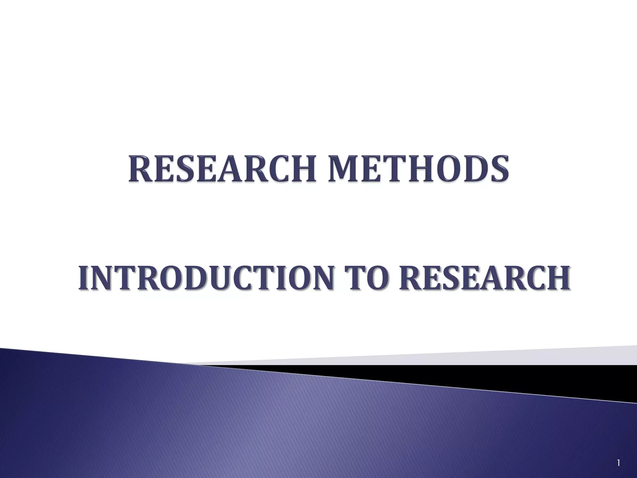 This document provides an introduction to research, covering key topics such as the definition of research, objectives of research, characteristics of good research, and types of research. Research is defined as a systematic, objective investigation to solve problems and expand knowledge. It aims to discover answers through scientific inquiry. There are two main types of research: quantitative research, which uses numerical data to test hypotheses and predict outcomes, and qualitative research, which explores meanings, interpretations and experiences through open-ended questioning to understand issues. Both approaches are important and complementary in social science research.