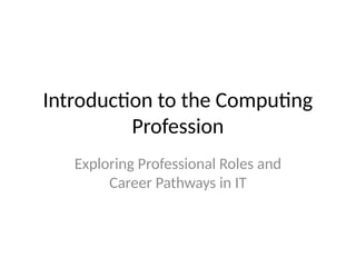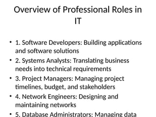 The document outlines various professional roles in the IT industry, including software developers, systems analysts, project managers, network engineers, and more, detailing their responsibilities and key skills. It emphasizes the importance of collaboration among these roles for project success and highlights the need for continuous learning in the rapidly evolving tech landscape. Additionally, it includes activities aimed at enhancing understanding of role dependencies and resources for further exploration of IT career pathways.