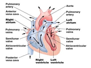 The cardiovascular system consists of the heart, blood vessels, and blood. The heart pumps blood through the blood vessels, supplying oxygen and nutrients to tissues and removing waste. Blood flows from the heart through arteries, then narrows into capillaries where gas and nutrient exchange occurs, and returns to the heart through veins. The cardiovascular system transports nutrients, gases, hormones, and removes waste through the blood in a closed circulatory loop.