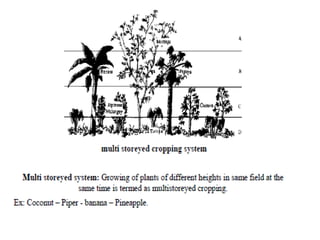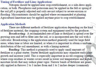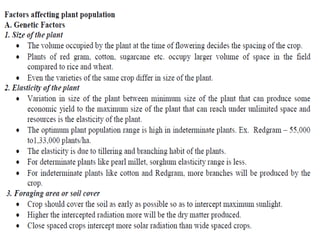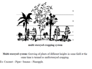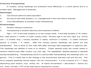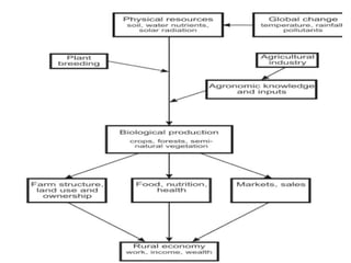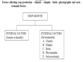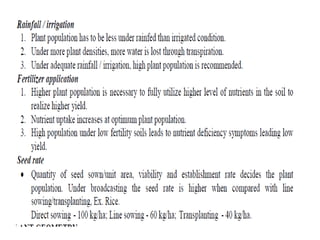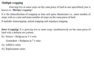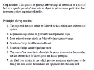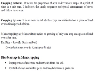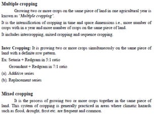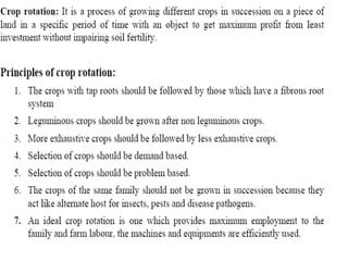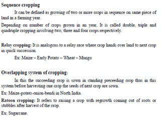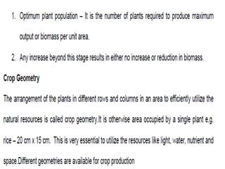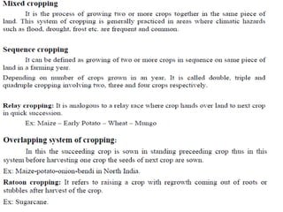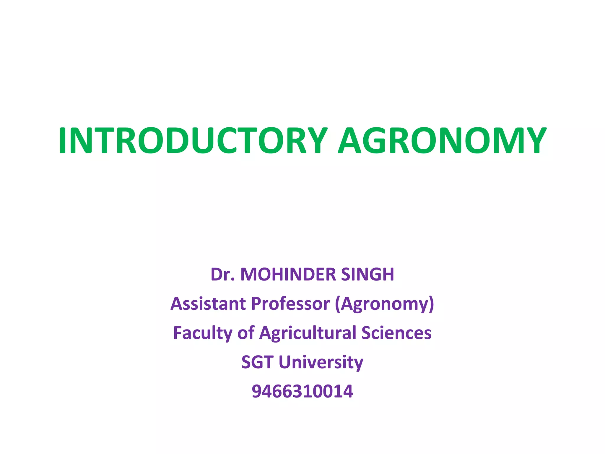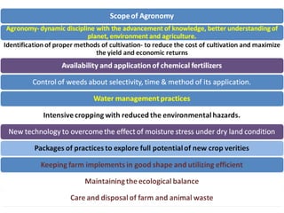 Agronomy is the study of crop production and soil management. It aims to maximize food production through understanding the relationships between soils, plants and their environment. Some key milestones in agronomy include the establishment of the Department of Agriculture in India in 1880 and the Indian Agricultural Research Institute in 1903. The Green Revolution of the 1960s greatly increased food production in India through the use of high-yielding varieties, irrigation, fertilizers and pesticides. Major crops are classified based on factors like life cycle, economic use, season and climate. Key soil types in India include alluvial, black, red, laterite and desert soils. Alluvial soils cover around 48 million hectares and are found in river basins.