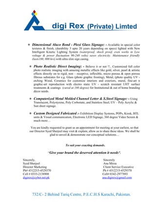 The document is a request from Digi REX (pvt) Ltd for an appointment to showcase their advanced signage and advertising technologies. They have state-of-the-art equipment and professional staff. Their solutions include animated display signs, customized product displays, 3D signage using robotic machines, dimensional signage with intelligent lighting, photo-realistic imaging on various surfaces, and custom fabricated exhibition displays. They request a meeting to explain these ideas and demonstrate conceptual solutions tailored to the client's needs.