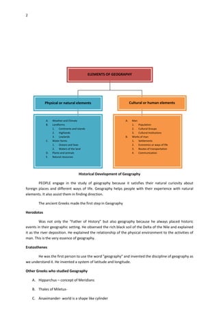 Geography is the study of the Earth, including both physical features like landforms, climate, and water bodies, as well as human features like population distribution, cultural groups, economic activities, and transportation networks. It combines aspects of both the physical and social sciences. The field can be divided into physical geography, which examines the natural environment, and human geography, which focuses on human habitats and activities. Key developments in the discipline include the early Greeks who began systematic study, German and French geographers in the 18th-19th centuries who advocated for regional and scientific approaches, and modern subfields that examine topics like geomorphology, climatology, biogeography, and urbanization.