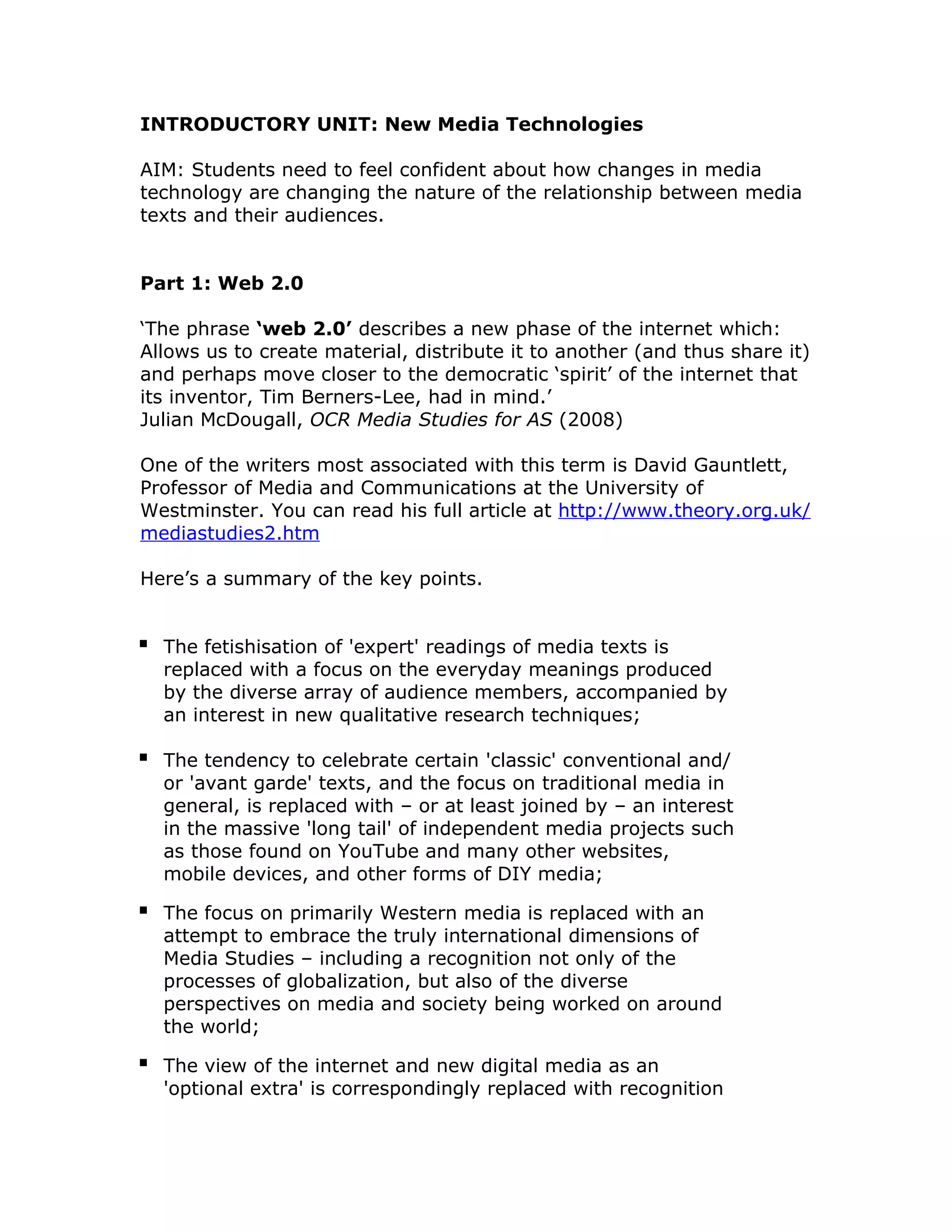 This document provides an introduction to new media technologies and how they are changing the relationship between media texts and audiences. It discusses several key aspects of new media, including: