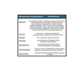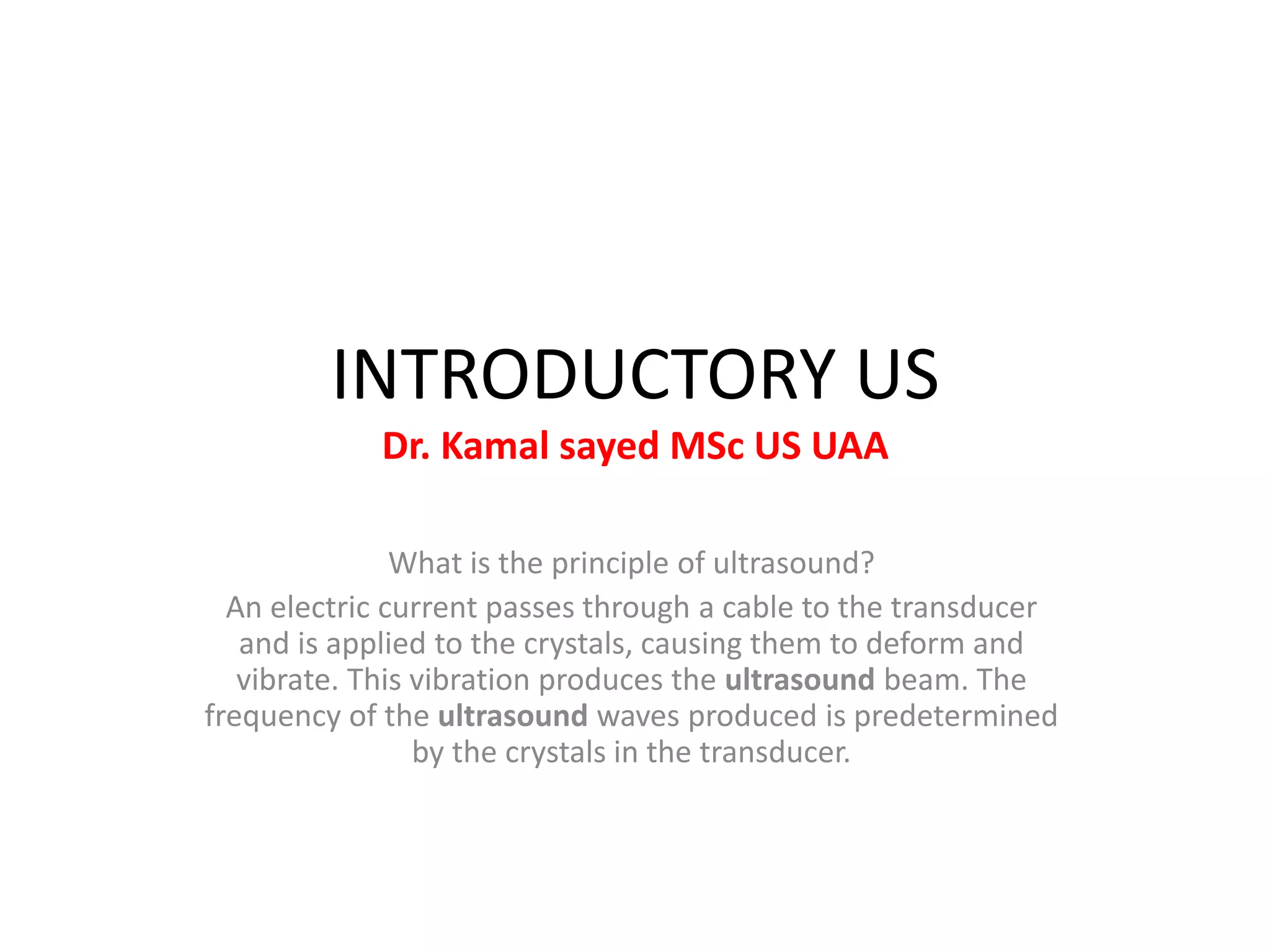 Ultrasound uses high-frequency sound waves to create images of organs and tissues inside the body. An electric current passes through a transducer, causing its crystals to vibrate and produce ultrasound waves. These waves travel through the body and bounce back when they encounter interfaces between tissues. The returned echoes are used to determine distances and construct images of the internal structures.