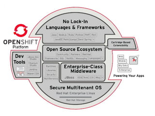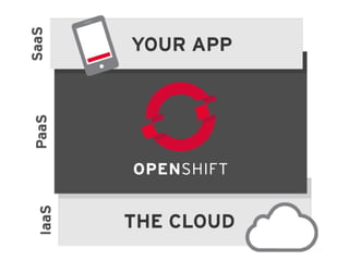 OpenShift is Red Hat's Platform as a Service (PaaS) offering that allows developers to build, test, deploy, and run applications in the cloud. OpenShift handles infrastructure, middleware, and management so developers can focus on designing and coding applications. It provides instant provisioning, scaling, easy deployment, and a free quota to get started developing with languages like Java, Ruby, PHP, and more.