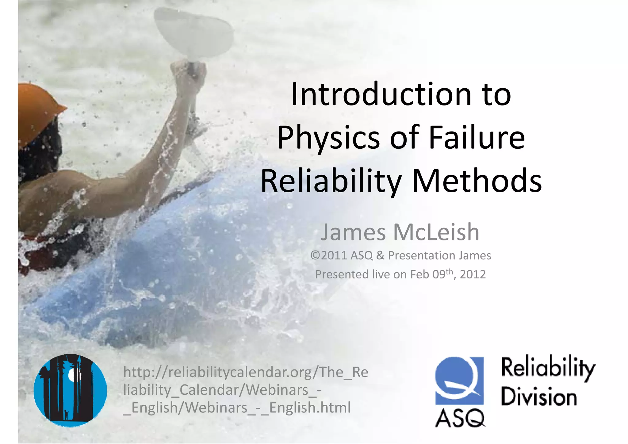 The document presents an introduction to the physics of failure and reliability methods, highlighting the importance of understanding failure mechanisms to improve product integrity and reliability. It outlines various failure categories, the proactive approach of reliability physics, and the limitations of traditional product development processes in effectively detecting failures. The document encourages participation in reliability webinars and outlines the qualifications of presenter James McLeish, emphasizing the need for better engineering practices in product reliability.
