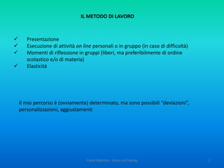 Il documento descrive un'iniziativa del MIUR e del CINI per introdurre il coding nelle scuole italiane, fornendo strumenti accessibili per insegnare l'informatica e sviluppare il pensiero computazionale. Questo approccio mira a migliorare le competenze logiche e di problem solving degli studenti attraverso un metodo ludico. Sono evidenziati gli obiettivi educativi che includono la creatività, la progettazione di algoritmi e la capacità di gestire la complessità.