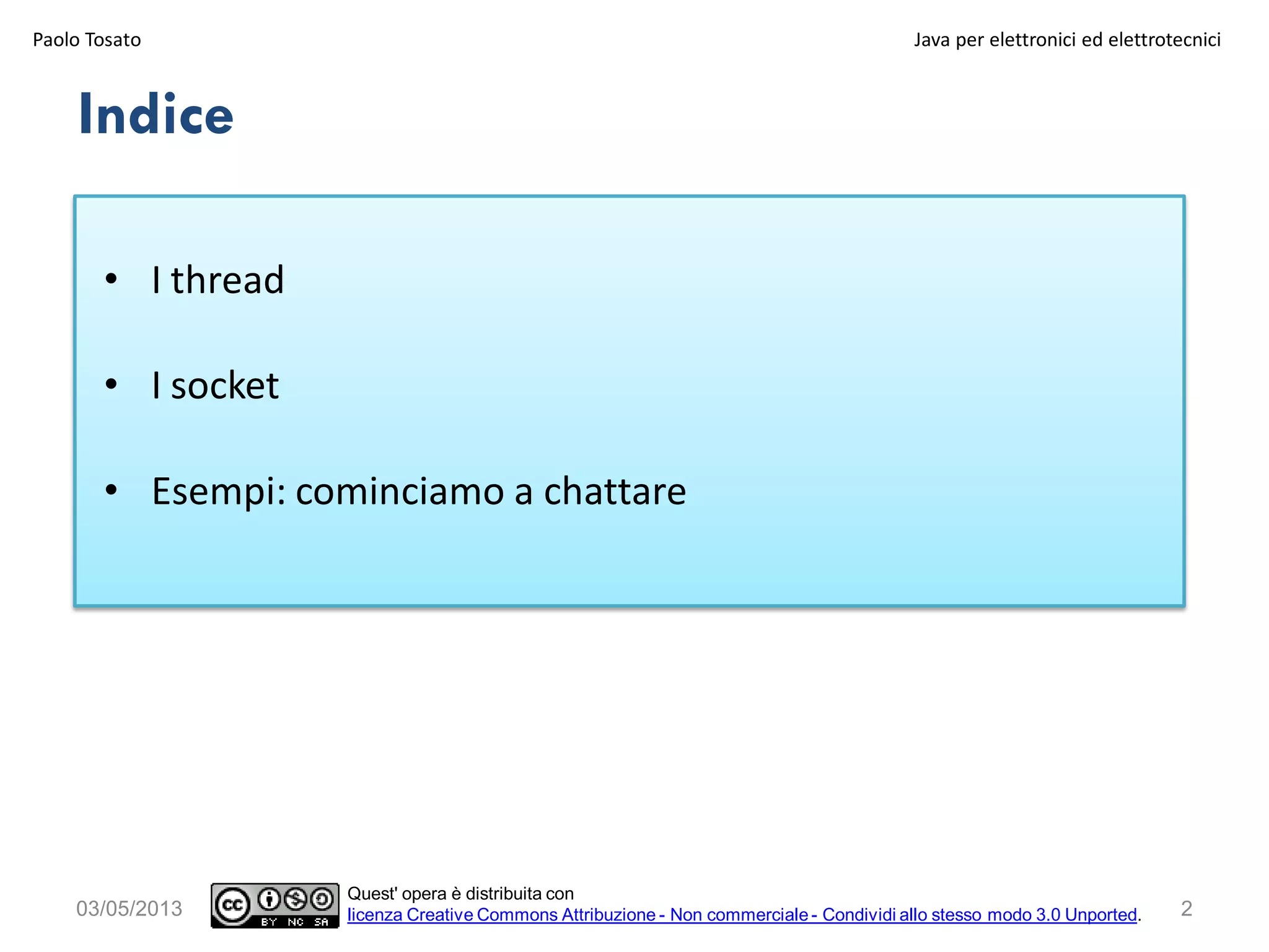 Il documento presenta una lezione di Java, focalizzandosi sui thread e sui socket nell'ambito delle applicazioni di rete. Viene descritto il funzionamento dei thread, la loro gestione e l'uso di socket per creare applicazioni client/server. Inoltre, vengono forniti esempi di codice per implementare una semplice chat tra client e server.