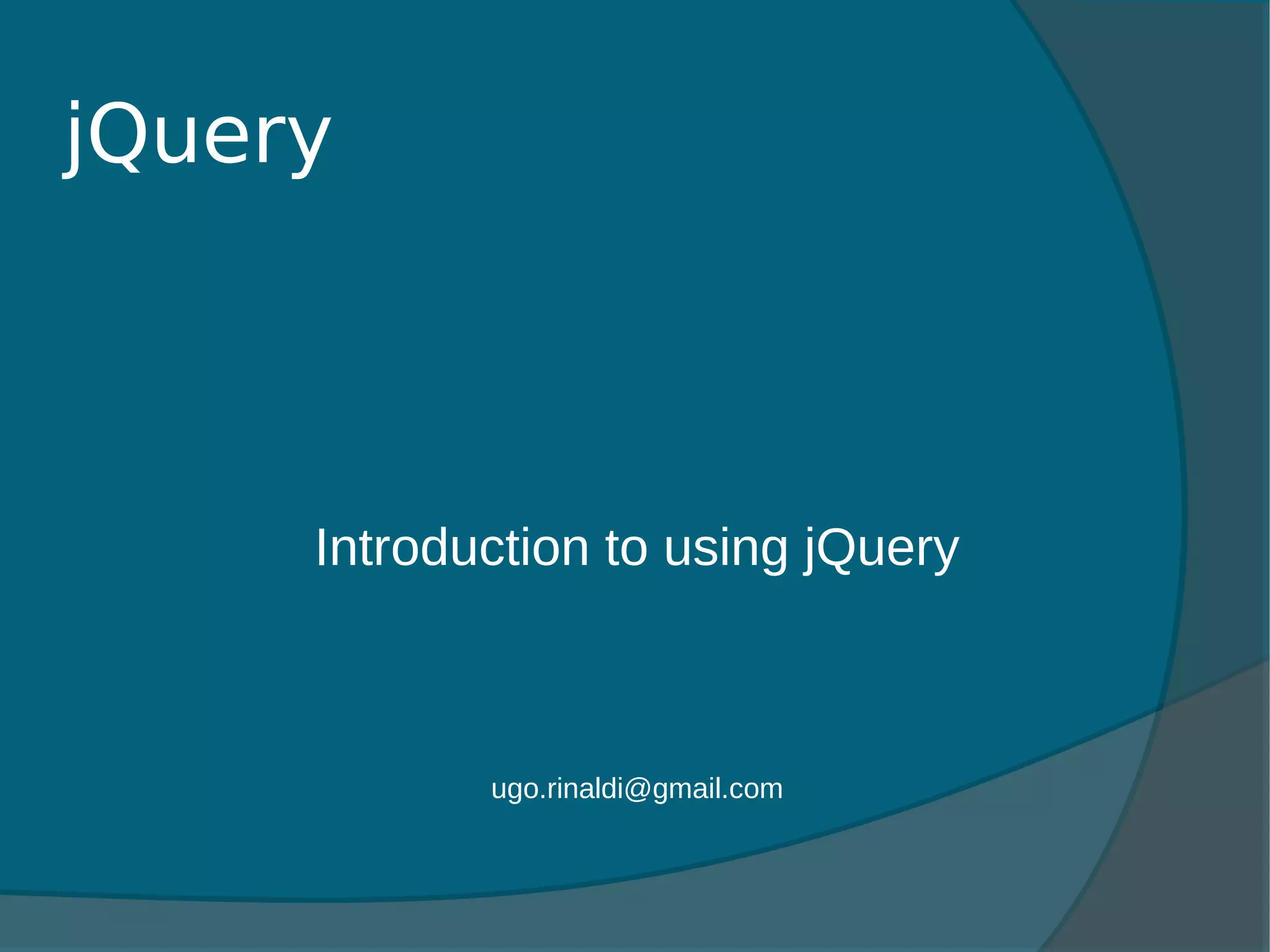 jQuery is a JavaScript library that simplifies HTML document manipulation and event handling. It allows developers to select elements, hide/show them, modify styles, and handle events with simple one-line statements. jQuery also simplifies AJAX calls and DOM manipulation. Common jQuery features include HTML/DOM manipulation, CSS manipulation, event handling, effects/animations, and AJAX. jQuery code uses CSS-like selectors and methods to target elements and perform actions on them.