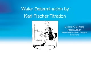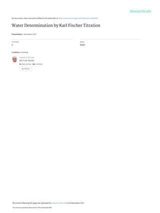 The document discusses the Karl Fischer titration technique for determining water content in samples. It describes the history of the technique developed by Karl Fischer in the 1930s. The technique is based on a chemical reaction between water and other reagents like iodine, sulfur dioxide, and a solvent. Depending on the water content, either volumetric or coulometric Karl Fischer methods are used to determine water over different concentration ranges. Now the technique is performed using automated Karl Fischer titration instruments.