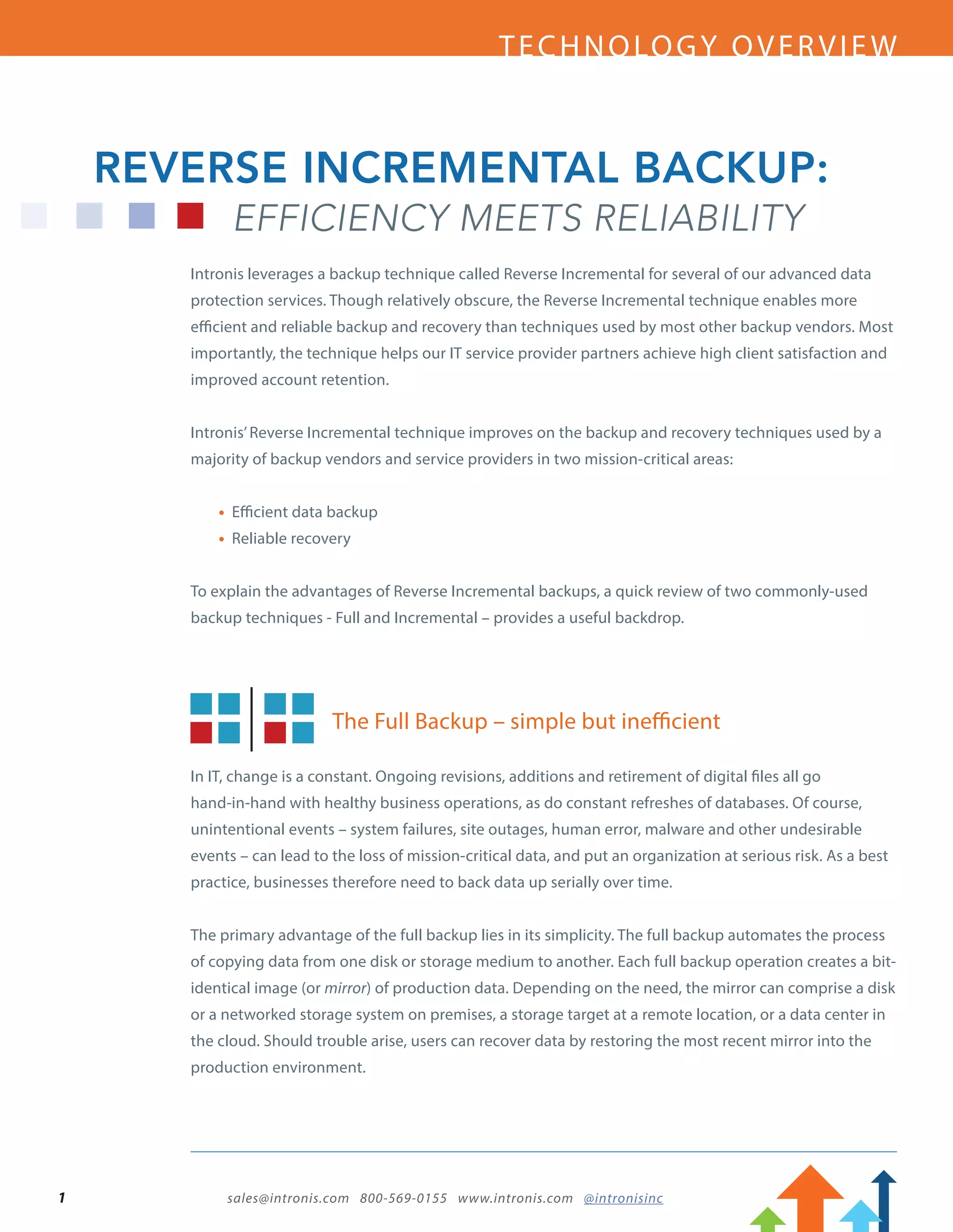 The document discusses Intronis' use of a reverse incremental backup technique that provides the efficiency of incremental backups and the reliability of full backups. A reverse incremental backup captures only changed data (deltas) since the last backup, but then synthesizes a full backup image that can be used for reliable recovery. This allows for efficient backups while also enabling restoration from a single full backup image like traditional full backups, reducing recovery risks and complexity compared to standard incremental backups.