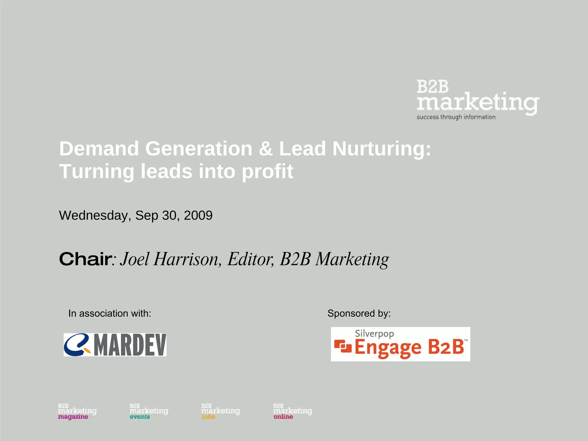 The document summarizes an agenda for a conference on demand generation and lead nurturing. It includes presentations on winning and nurturing leads in a web 2.0 environment using ShipServ as a case study, measurable integrated lead generation techniques, how to select the right technology to grow your business, a case study on a marketing campaign by IBM, and a panel debate with the speakers.