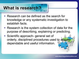 This document provides an introduction to nursing research. It defines research as the systematic investigation to establish facts through collecting and analyzing data. Nursing research aims to describe, explain, predict, and control phenomena related to health and of interest to nurses. It is important for nurses to conduct research so they can contribute to the generation of nursing knowledge and evaluate the effects of nursing care. Nurses can be involved in research as doers, conducting studies, and as consumers, applying research findings to practice. The document outlines different types of research, including quantitative and qualitative methods, and roles for nurses in the research process.