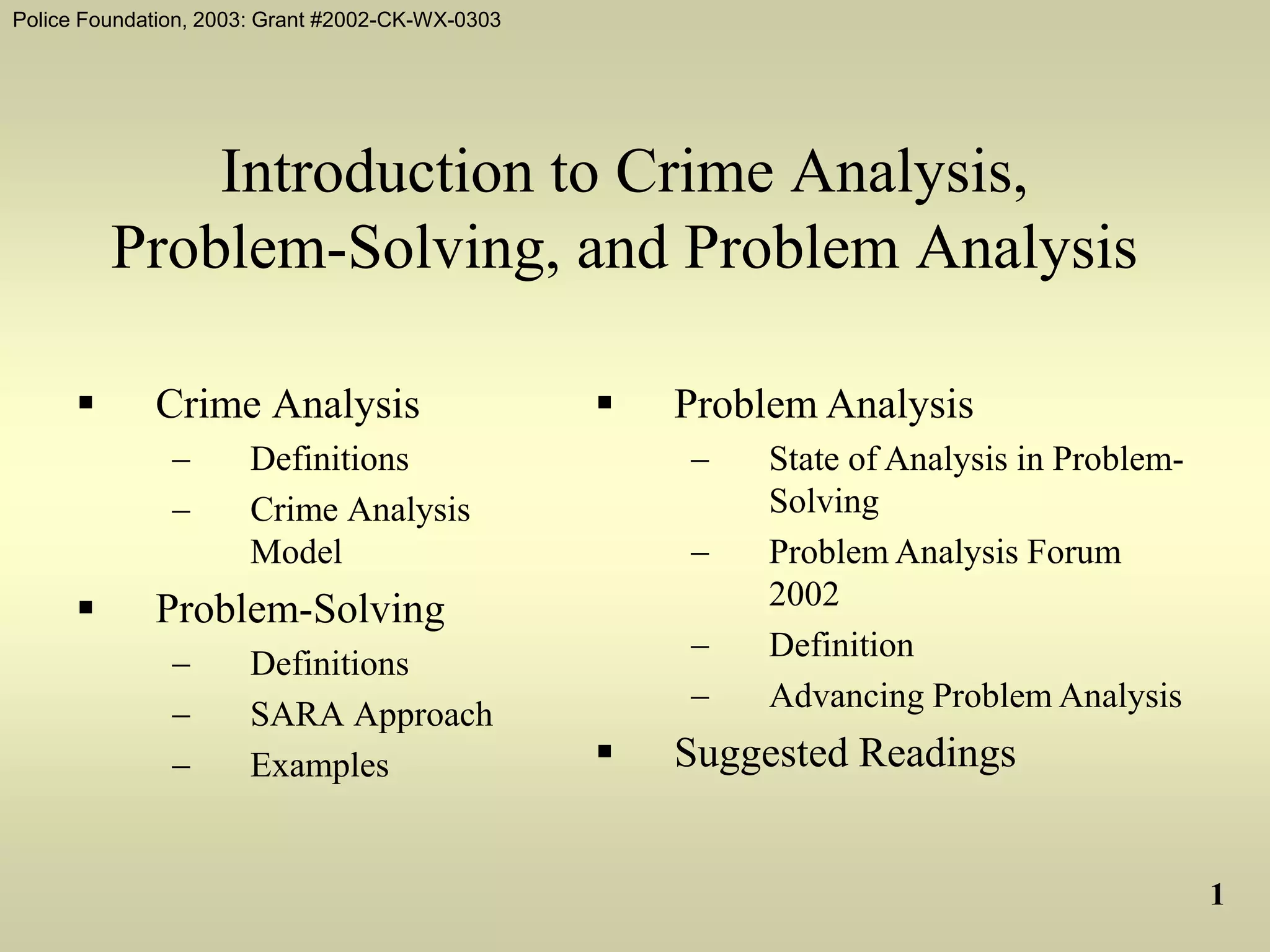 The document discusses crime analysis, problem-solving, and problem analysis. It provides definitions for crime analysis, intelligence analysis, criminal investigative analysis, tactical crime analysis, strategic crime analysis, and administrative crime analysis. It also defines problem-solving and describes the SARA (scanning, analysis, response, assessment) approach. Several problem-solving examples are provided. The document discusses the state of analysis in problem-solving and summaries a 2002 problem analysis forum. It provides a definition of problem analysis and discusses knowledge and skills needed for problem analysis. Finally, it discusses advancing problem analysis through the roles of policing agencies, academia, federal government, and other organizations.