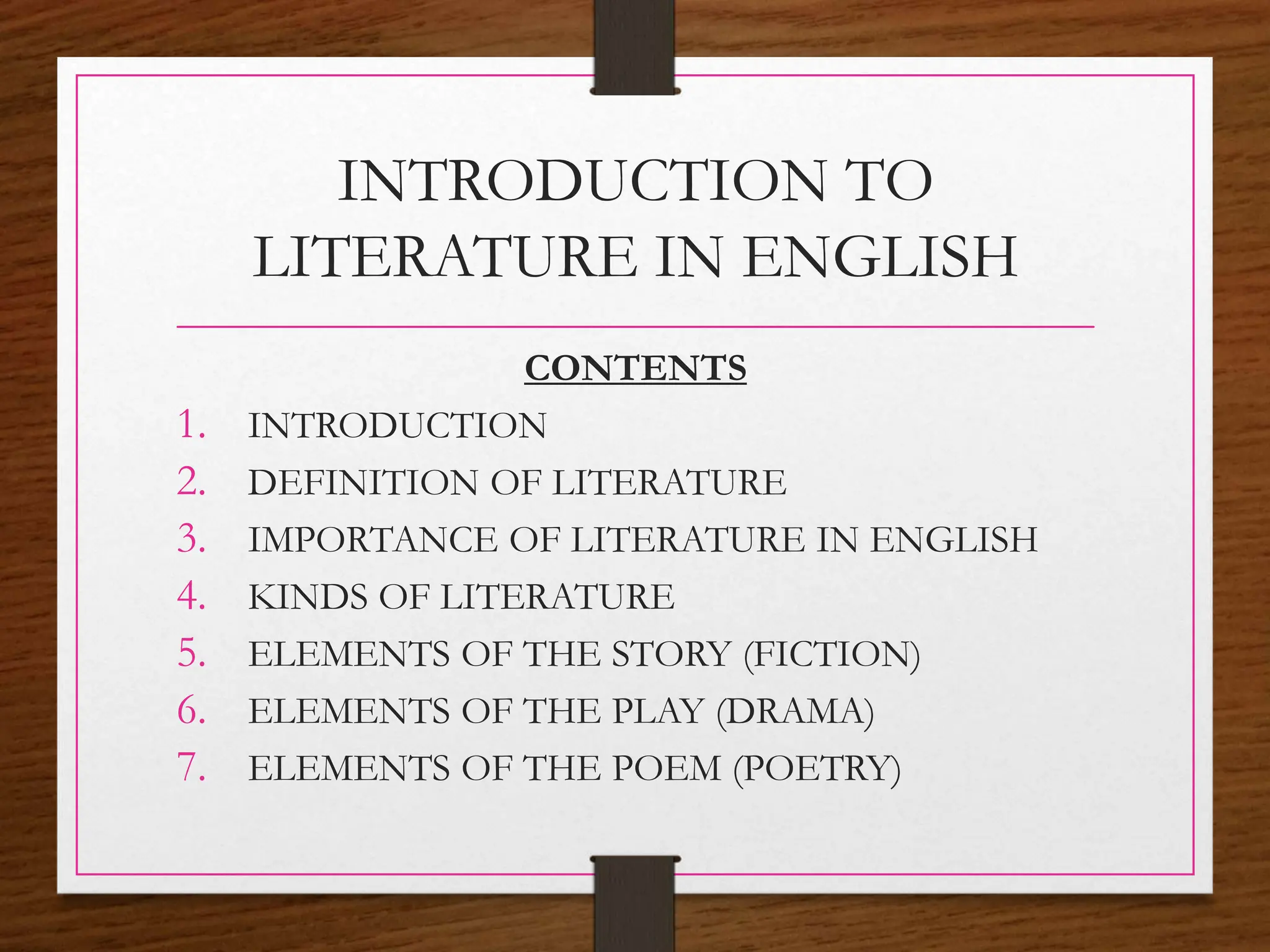 The document serves as an introduction to the study of literature in English, covering its definition, importance, types, and essential elements in literary analysis. It highlights the significance of literature in enhancing language proficiency, cultural understanding, and critical thinking skills. Key components discussed include elements of fiction like plot, characters, themes, and style, which are central to analyzing literary works.