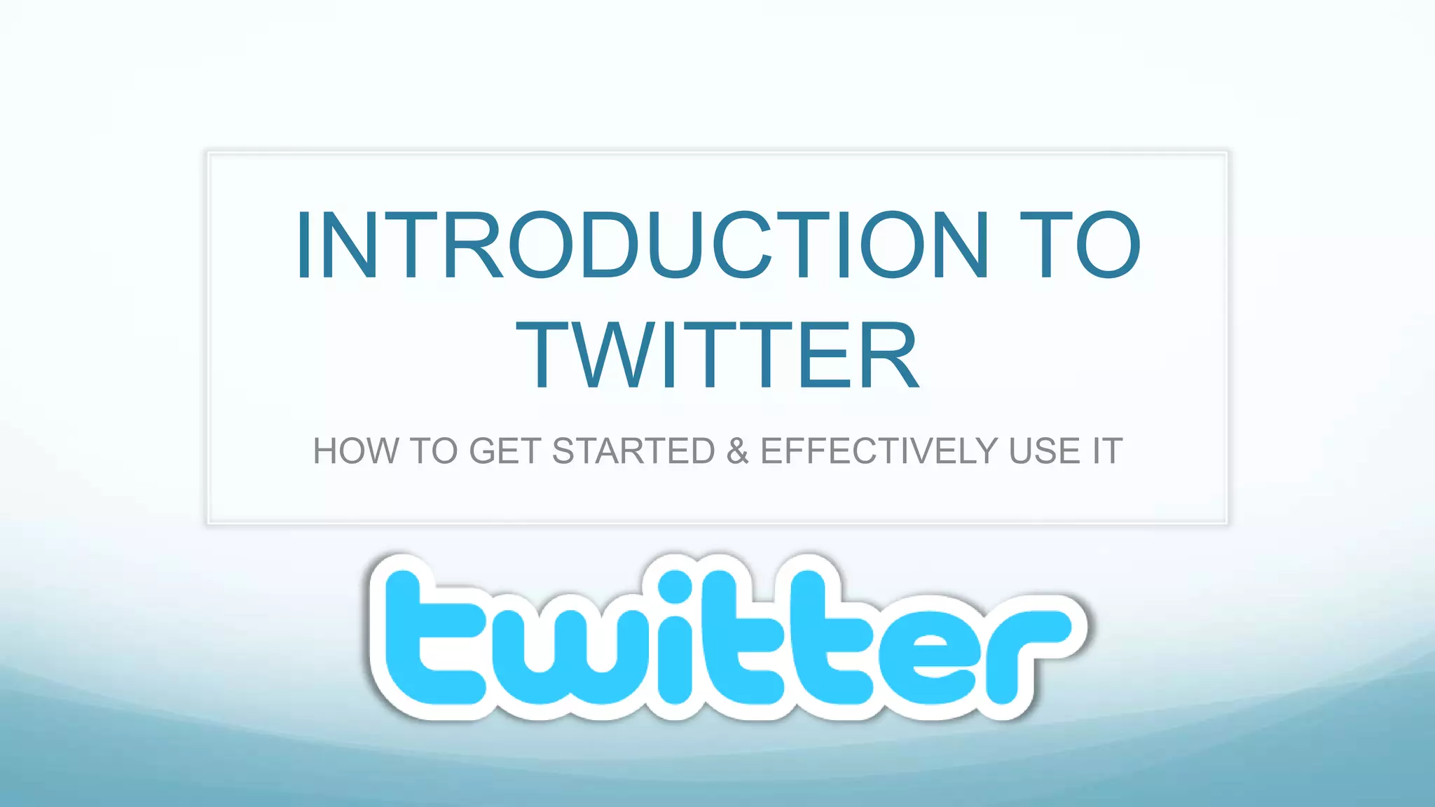 This document provides an introduction to Twitter, how to get started, and how to effectively use it. Twitter is a microblogging platform that allows users to post 140 character updates. It recommends starting by creating an account, following suggested users and understanding the interface. The document then offers tips on using Twitter for business goals like finding customers, engaging clients, and announcing promotions. It suggests how to find people and topics using search and hashtags, and how to effectively send tweets with links and third-party applications like TweetDeck.