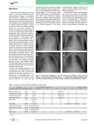 This document presents a case report of a 92-year-old man with a pleural infection caused by multidrug-resistant bacteria, treated successfully with intra-pleural colistin methanesulfonate after standard intravenous therapies failed. The use of intra-pleural colistin led to notable clinical and microbiological improvement, marking the first documented instance of this treatment approach in the literature. The authors conclude that intra-pleural colistin therapy should be considered for selected patients with similar infections, though further studies are necessary to establish its safety and efficacy.