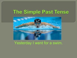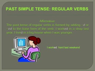 The document provides information on using regular and irregular verbs in the past simple tense in English. It discusses forming affirmative, negative, and interrogative sentences. It provides examples of using regular verbs like "work" in the past tense and irregular verbs like "go" and "see." It also describes using auxiliary verbs like "did" and "didn't" to form negatives and questions. Finally, it outlines three common uses of the past simple tense: to talk about specific past times, describe past periods, and habitual past actions.