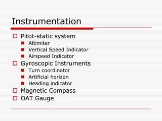 - Gyroscopic instruments like the turn coordinator, artificial horizon, and heading indicator.