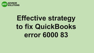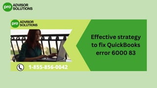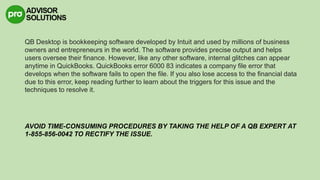 The document explains QuickBooks error 6000 83, which occurs when the software fails to open a company file, often due to file relocation, data corruption, or incorrect hosting settings. It provides troubleshooting steps, including moving the company file to its default location and using the QuickBooks Tool Hub to repair any file issues. For ongoing problems, the document suggests consulting a QuickBooks expert for assistance.