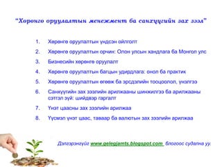 ба санхүүгийн зах зээл” 1. Хөрөнгө оруулалтын үндсэн ойлголт 2. Хөрөнгө оруулалтын орчин: Олон улсын хандлага ба Монгол улс 3. Бизнесийн хөрөнгө оруулалт 4. Хөрөнгө оруулалтын багцын удирдлага: онол ба практик 5. Хөрөнгө оруулалтын өгөөж ба эрсдэлийн тооцоолол, үнэлгээ 6. Санхүүгийн зах зээлийн арилжааны шинжилгээ ба арилжааны сэтгэл зүй: шийдвэр гаргалт 7. Үнэт цаасны зах зээлийн арилжаа 8. Үүсмэл үнэт цаас, таваар ба валютын зах зээлийн арилжаа Дэлгэрэнгүйг www.gelegjamts.blogspot.com блогоос судална уу.