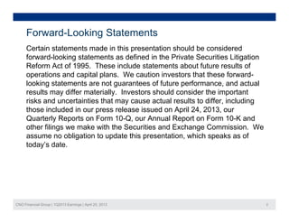 1. CNO Financial reported financial and operating results for 1Q13 with earnings growth across its core business segments and higher operating EPS compared to 1Q12.