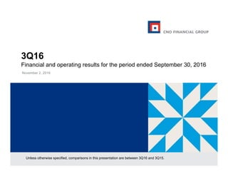 - CNO Financial Group reported financial and operating results for 3Q16 with comparisons to 3Q15.