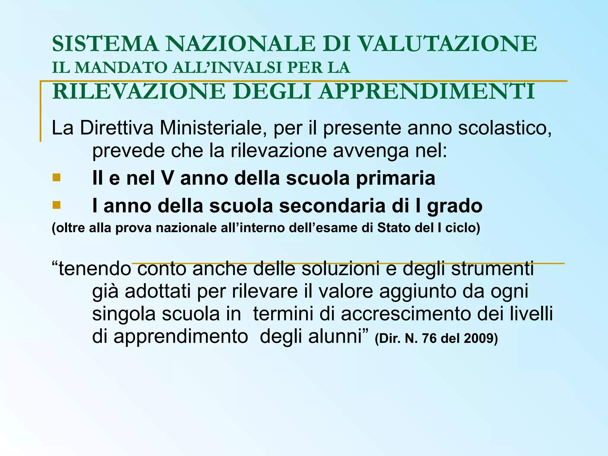Il documento descrive il mandato all'INVALSI per la rilevazione degli apprendimenti, con focus su prove di italiano e matematica per diverse classi scolastiche. Le prove hanno l'obiettivo di fornire strumenti di diagnosi alle scuole per migliorare gli apprendimenti degli alunni, valutando competenze linguistiche e matematiche. Includono questionari per raccogliere dati sugli studenti e il loro contesto familiare, per supportare l'interpretazione dei risultati.