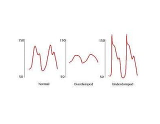 This document provides an overview of arterial blood pressure monitoring. It discusses the history and development of non-invasive blood pressure measurement techniques. It then focuses on the components, principles, and technical aspects of invasive arterial blood pressure monitoring using an intra-arterial catheter connected to a transducer system. Key points covered include the components of the measuring system, optimizing the system's natural frequency and damping, and the importance of zeroing and leveling the transducer.