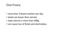 The document outlines the differences between invasive and osmotic diarrhoea. Invasive diarrhoea is characterized by inflammation of the large bowel and can lead to symptoms such as bloody stools, while osmotic diarrhoea results from malabsorption and causes moderate stool volume without blood. Treatment for both types includes rehydration therapy, with antibiotics used specifically for invasive diarrhoea.