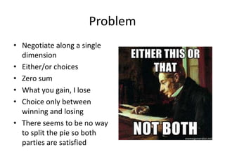 This document outlines strategies for effective negotiation and mutual gain. It recommends inventing creative solutions that expand options rather than assuming a fixed pie. Negotiators should brainstorm many potential agreements before deciding, separating inventing from judging ideas. They should look for shared and differing interests between parties to craft solutions with benefits for both sides. The goal is to understand others' perspectives and make their decision to agree as easy as possible.