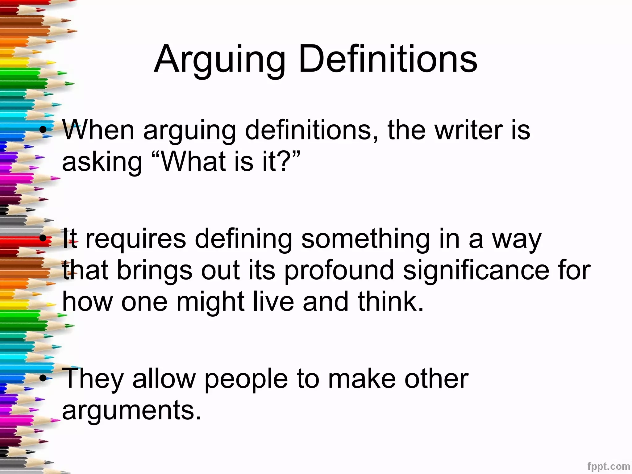 This document provides guidance on writing arguments about definitions and causes. For definitions, it suggests focusing on whether a specific situation fits a definition, arguing for a particular definition of a misunderstood term, or identifying an implicit definitional argument. For causes, it recommends analyzing events or trends to lay intellectual groundwork before asserting single or multiple causes, or challenging common views. The document offers questions to consider and provides tips on developing theses, finding support, arranging arguments, and revising.