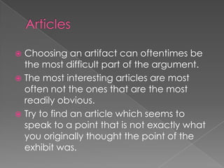 This document provides instructions for analyzing an artifact to invent an argument. Students are told to choose an artifact, determine its intended purpose or "exigence", and analyze how it addresses its intended audience. The document explains that the intended meaning and purpose of an artifact depends on the specific audience. It provides an example analysis of a video shown to protestors to call them to deeper action. Students are assigned to find an artifact, determine its exigence and how it aims to affect its audience, and present their analysis in a creative format.