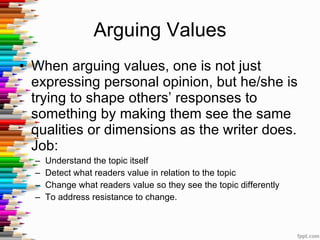 When arguing values, a writer aims to shape readers' perspectives by making them see qualities or dimensions of a topic in the same way. To do this, the writer must research the topic, understand differing viewpoints, assert and support their own perspective, and counter potential counterarguments. The argument should address an issue in public discourse, not just express a private opinion. Key steps include analyzing who benefits and is harmed by the topic, inventing a thesis that reveals something unique, using evidence like analogies and testimony to support claims, and carefully examining opposing views.