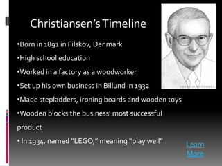 Ole Kirk Christiansen founded the Lego company in 1932 in Billund, Denmark. He began his business making wooden toys and stepladders but found the most success with wooden blocks. In 1934 he named the product "Lego", meaning "play well" in Danish. Lego pieces interlock through the use of studs and tubes that push against each other to hold bricks together securely. Christiansen aimed to create an affordable toy for all children to enjoy playtime, regardless of wealth.