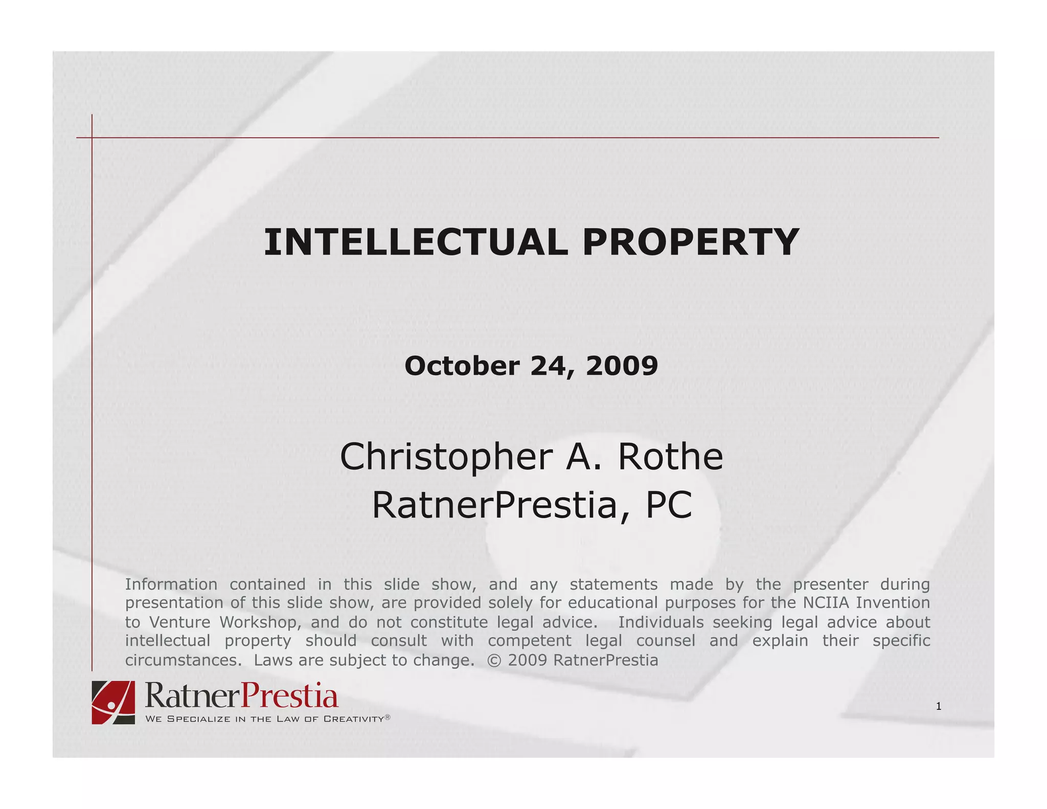 The document provides an overview of intellectual property (IP), detailing its legal categories in the U.S. such as copyrights, trademarks, and patents. It explains the rights associated with each type of IP, including the protection of original works, trademark identification, and patent requirements. Additionally, it discusses the importance of trade secrets and provides guidance on how to handle inventions and file patent applications.