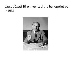 Lázso József Bíró invented the ballpoint pen in 1931. He was born in Budapest, Hungary in October 1899. His family was Jewish and he worked as both a journalist and inventor. While working as a journalist, he noticed how newspaper ink dried quickly and was viscous, which led him to experiment with different tip designs until discovering that a small ball inside the tip allowed the viscous ink to write well. He died in Buenos Aires, Argentina in 1985.