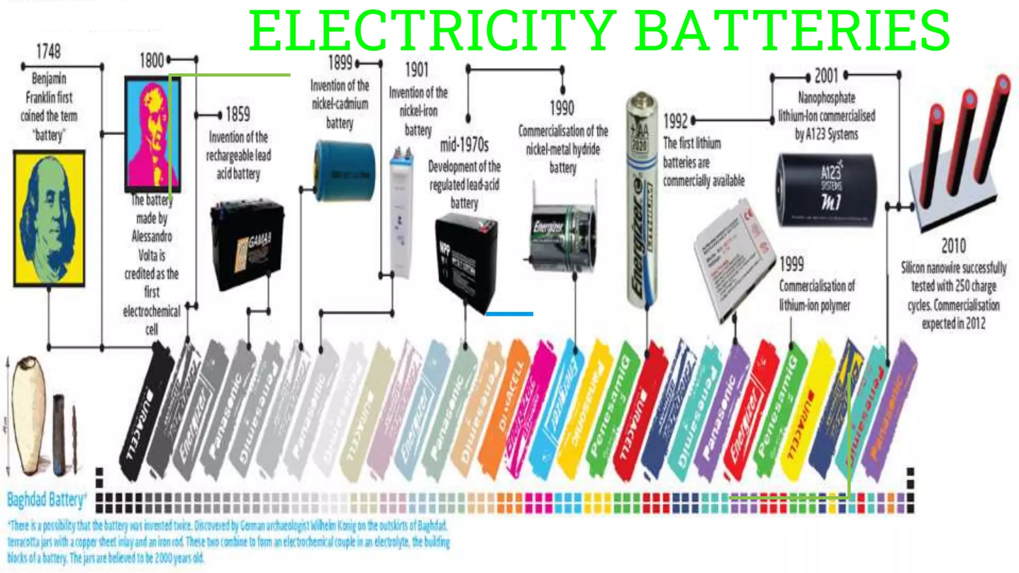 The document lists important figures in the development of batteries from 1800 to 1955, including Alessandro Volta in 1800 who created the first battery, and developments that led to batteries powering mobile phones, which a survey found are generally used by all family members except those under 7 years old.