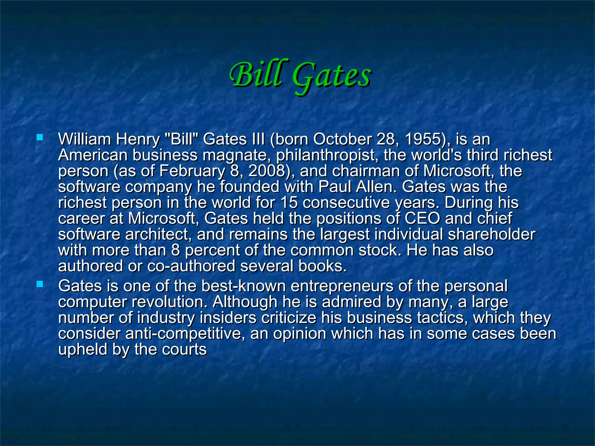 Bill Gates co-founded Microsoft and became one of the richest people in the world. As a teenager, he took an interest in programming computers and wrote one of his first programs on a GE system in BASIC. He studied computer source code which helped him get a job writing software as a teenager. Gates graduated from Harvard but left before completing his degree to focus on Microsoft, which he co-founded with Paul Allen in 1975.