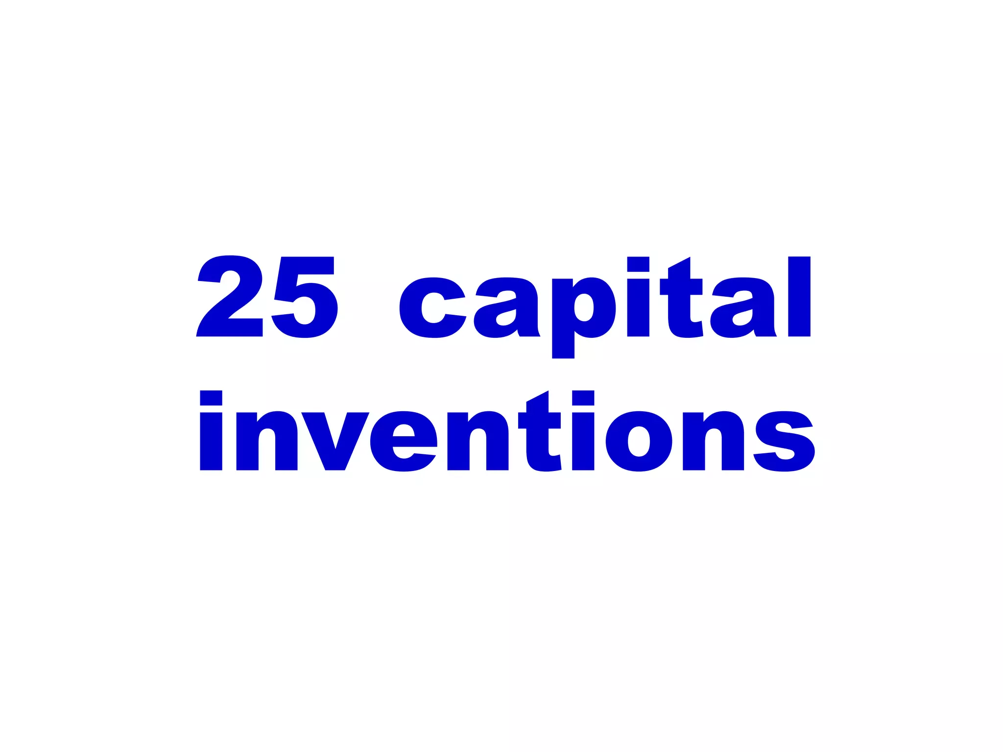 This document lists 25 inventions from different eras, including tools from the Early and Middle Stone Age, the wheel and axle around 3500 BC, paper in China in the 2nd century BC, the printing press invented by Gutenberg in 1436, the revolver invented by Colt in 1835, the telephone patented by Bell in 1876, the steam turbine invented by von Linde in 1876, the light bulb invented by Edison in 1879, the first gasoline-powered automobile invented by Benz in 1886, the Wright brothers' first controlled, powered and sustained heavier-than-air human flight in 1903, the transistor invented by Fleming in 1928, the first programmable, fully automatic digital computer invented by Z