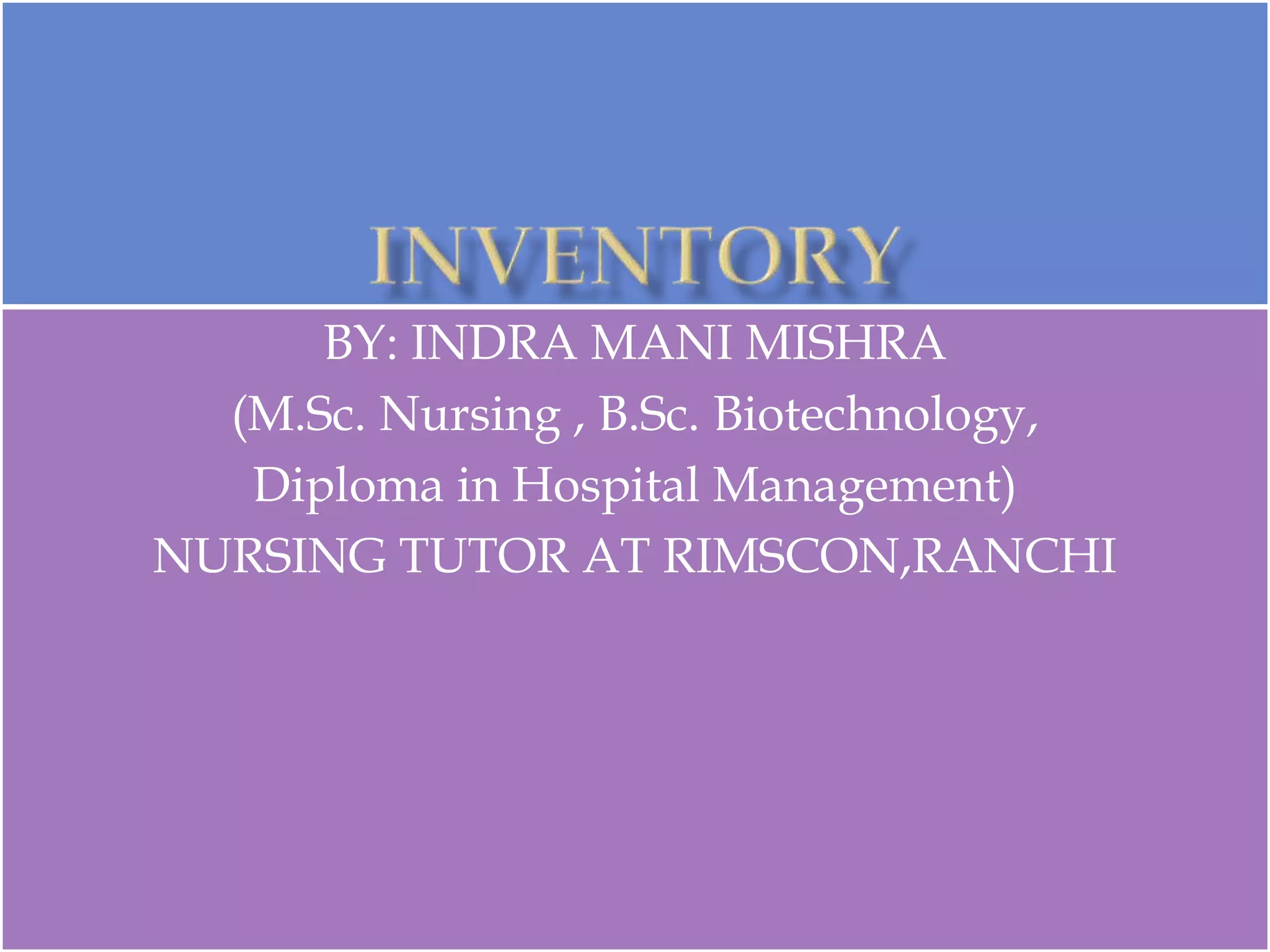 Inventory control is a technique used by organizations to maintain desired inventory levels. It involves recording all materials, parts, supplies, work-in-process, and finished products and keeping them in stock for a period of time. The goal is to balance inventory levels in a way that best serves the economic interests of the organization. This includes protecting against fluctuations in demand and production as well as controlling stock volumes and distribution. Effective inventory control ensures adequate supply while minimizing costs and better utilizing available stocks. Key aspects of inventory control include planning, procurement, receiving/inspection, storage/issuing, recording, verification, and material standardization. Various analysis methods can be used to classify inventory items for selective control, including ABC analysis, VED analysis